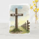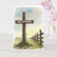 The front design shows a tall wooden upright form with a crossbeam, set slightly off-centre in the foreground, with the words “HE IS RISEN” painted in white across the horizontal beam. The wood looks rough and weathered, and small tufts of green grass and thin sprouts gather at its base like a quiet sign of new life 🌷. Off to the right, a worn wooden fence runs back into the distance, gently leading your eye across an open field that feels calm and welcoming. The land stretches out in soft greens, and the light falls across it like early morning, giving the scene a tender, close-to-the-heart mood. Above, the sky shifts from pale yellow near the horizon into soft blue and muted grey, creating a soothing backdrop. The background has a watercolor look, while the wood grain and edges of the fence are more defined, adding texture and depth. The white lettering sits centred on the crossbeam, standing out clearly against the darker timber 🐇. In the distance, the fence narrows toward a faint vanishing point beneath the gentle gradient of the sky.
