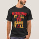 This black t-shirt features the text "RISKING IT ALL" at the top in a bold red font. Below, "TO" is stacked above a heart shape, both in red. The phrase "SAVE IT ALL" is at the bottom in a bold yellow font. Stylized flame graphics are incorporated into the words "IT" in both the top and bottom phrases. This design honours the bravery and dedication of firefighters.