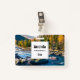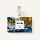 Name tag with a scenic photograph featuring tree covered mountains in autumn colours. A vibrant river flows around a multitude of rocks.