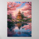A small, wooden Japanese pagoda stands gracefully on the bank of a calm river, its reflection mirrored in the still water. Surrounding it is a vibrant spring landscape, with lush green grass and blooming cherry blossom trees. The gentle sound of the flowing water and the sweet fragrance of the cherry blossoms create a serene and tranquil atmosphere.
