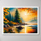 A serene river painting graces the living room, depicting a tranquil scene of a rocky riverbank surrounded by a pine forest in the midst of autumn. Created with rich oil paints, the artwork captures the warm hues of a sunlit afternoon, casting a golden glow on the landscape. This portrayal of nature's beauty, where the river peacefully winds its way through the rocky terrain, embraces the enchanting essence of a forested sunset landscape, inviting viewers to find solace in the harmony of earth and water.