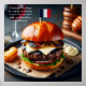 Experience a Riviera rhapsody of flavours with this sensational French Brie & Caramelized Onion Burger. A juicy beef patty, seared to perfection, is layered with creamy brie cheese, sweet caramelized shallots, and a dollop of Dijon aioli, all nestled inside a soft brioche bun. A miniature French flag adds a touch of French flair, while a glass of red wine completes this authentic French culinary creation.