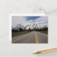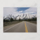 This photo features an empty road leading into the Teton Mountain Range in Wyoming.