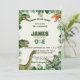 Celebrate your little one's big day with this adorable and adventurous dinosaur-themed 1st birthday invitation! Featuring a collection of friendly, hand-painted style dinosaurs like a T-Rex, Brontosaurus, and Triceratops surrounded by lush jungle foliage and vibrant greenery, this design sets the perfect prehistoric scene for your child's first milestone. The clean, neutral background allows the green and earthy tones to pop, making it a beautiful and exciting way to invite guests to your 'One-asaurus' party. Easily personalize the template with your child's name (like "James" shown here), the party date, time, and location for a custom touch.