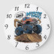 A vibrant and playful illustration for a children's monster truck t-shirt, featuring a large, colourful monster truck with oversized