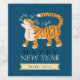 This retro and cute chinese new year holiday wine label features a roaring tiger on a navy blue background. Personalize it for your needs. You can find matching products at my store.