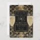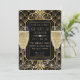 This custom New Year's eve party invitation features a roaring twenties Great Gatsby theme in gold and black. A glamourous, retro Hollywood style frame is placed in the centre, over a vintage style art deco pattern. A sparkling champagne glass is placed on either side and glitter diamonds are sprinkled across the bottom.