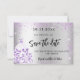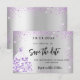Un fond moderne d'aspect argenté décoré de paillettes fausses violettes, de scintillements et d'une robe. Personnalisez et ajoutez une date et des noms. Le texte : Save the Date est écrit avec un grand style de lettrage manuscrit tendance.