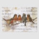 A group of five vintage European robin birds sit on a branch on sheet music with gold and silver paint accents. Great idea for decoupage!