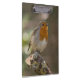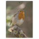 A European Robin (Erithacus rubecula) standing on a broken tree branch covered in lichens.