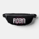 This graphic offers a contemporary reinterpretation of the Robin emblem, blending classic elements with modern design sensibilities. The logo centres around a bold, geometric depiction of the word "ROBIN," set in stark white against a deep black background, encapsulated within a striking pink circle that adds a dynamic visual contrast. The circle not only frames the text but also breaks through it, suggesting Robin's emergence from the shadow of Batman to establish his own identity. The use of pink adds an unexpected twist, lending a fresh and modern vibe while still paying homage to the traditional red associated with Robin. This design captures the essence of Robin's evolution as a character, blending his heroic legacy with a sleek, urban aesthetic suitable for a new generation of fans.