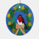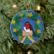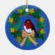 A Christmas ornament with a robin redbreast perching on a holly and ivy wreath with a golden bow, from a handpainted paper collage by Judy Adamson. Greeting Card with this design also available.