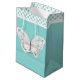 Sac-cadeau de taille moyenne et chic fait en bleu d'oeuf de robin, avec des graphiques d'un joli papillon blanc, à l'avant et à l'arrière, et bande de pois de polka, autour du sommet. Personnalisez le texte blanc, à l'avant du sac, pour lire ce que vous voulez. Un grand sac cadeau et du papier de tissu assorti sont disponibles.
