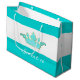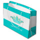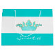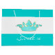 Large chic gift bag done in a robin's egg blue and white horizontal stripe pattern. Graphics of a blue and gold tone crown, decorates the middle of the bag. Personalize the white text, on the bottom of the bag to suit your occasion. Great for birthdays, Sweet 16, congratulations and Quinceañera.