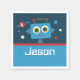 Cute personalized happy 1st birthday paper napkins with colourful robot surrounded by stars, with giant eyes and antennae on his head. A planet has a number 1 and customizable name. PinkInkArt original!