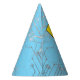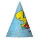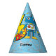 A cute blue and yellow robot on a computer circuit background. Great birthday party hat for the three year old!