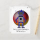 A cool and slightly funny design featuring a royal blue robot in front of a shaded red and yellow sphere. A get well message for someone... customize as desired.
