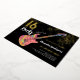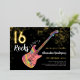 For the girl that loves to rock, cool rock guitar music themed 16th birthday party modern invitation. Rock and roll colourful electric guitar with gold glitter and musical note illustrations with personalized gold modern calligraphy typography on a black background. This easy to use template creates the perfect personalized invitation to celebrate sixteen in rockstar style. Perfect if you have a live band or are a guitarist, musician and music lover. Unique musical instrument original artwork by artist Catherine Sweetman