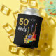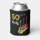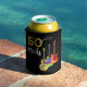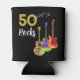 50 Rocks 50th birthday party can coolers with three cool watercolor guitar designs on black background. An electric guitar with Fire flame pattern and red pick guard, a multicolored semi acoustic guitar and a psychedelic classic acoustic guitar art illustration with personalized black and gold modern cool typography. Celebrate fifty in rock n roll style ideal for a guitarist, musician and music lovers. This cool modern musical instrument design is the perfect way to rock a fiftieth birthday. Original artwork by artist Catherine Sweetman