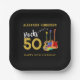 Add a name to these cool Rocks 50 modern gold typography 50th birthday party personalized paper plates with musical notes and three cool colourful guitar designs on a black background. Psychedelic electric guitar, semi acoustic guitar and acoustic guitar art illustration in vibrant bright colours. Easy to use template to change the age and name creating the perfect personalized party plates to celebrate fifty in rock n roll style and is ideal for a guitarist, musician and music lovers. This cool modern musical instrument design celebrates the music energy of this wonderful musical instrument and is the perfect way to rock a fiftieth birthday celebration. Original artwork by artist Catherine Sweetman