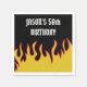 Throw a rocking birthday bash with personalized party supplies like these paper napkins featuring illustrations of flames in yellow and red set against a black background. Your custom message is spelled out in white heavy metal style lettering.