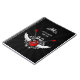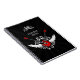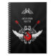 Personalized notebook with rock 'n' roll illustration featuring two crossed electric guitars with wings and vintage baroque embellishments on red, white and black.
