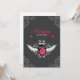 Unconventional wedding invitation on fuchsia pink and grey featuring a rock and roll theme with illustration of electric guitars, wings and elegant baroque vintage ornaments.