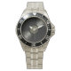 Has heft and feel of expensive stainless steel quartz watches. Good band with safety catch. I removed links, which is easy because engraved arrows show direction to push the linking pins. As always by this seller, the image (a railroad logo) is a perfect reproduction of my emailed image, and is precisely spaced and aligned.