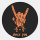 Gritty rock hand salute with spiked wristband and "Rock You" caption. Black/orange graphic, on t-shirts, hoodies, cards, gifts.