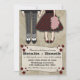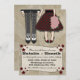 A couple in rockabilly style outfits hold hands over a grungy alternative background, with texts on a scroll like banner and featuring some punk like floating stars as highlights. The bride wears a black and red polka dotted dress, a pair of skull buckled shoes and carries a large bunch of pink roses. The groom wears some grey tartan turned up pants, some black and white wingtip shoes, and a tuxedo jacket.