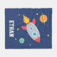 A personalized kids blanket with a rocket ship blasting off into outer space among the stars and planets across a dark blue background. Personalize with name of child. Send the little one on a space adventure in dreamland!