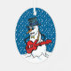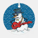 This ornament features a rocking snowman wearing sunglasses and playing a guitar in the snow.