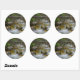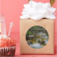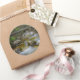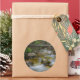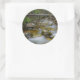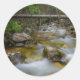 Round souvenir photo sticker with water with motion-blur in a rocky creek in a forest in Norway with a fallen tree as a bridge over it.