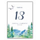 Ce numéro de table de mariage de destination Rocky Mountain est parfait pour un mariage extérieur. Le design comprend un paysage sauvage peint en bleu et vert avec des pins d'aquarelle, des oiseaux et des montagnes. La carte s'imprime à l'avant et à l'arrière (double face). Ajoutez chaque numéro de table dont vous avez besoin à votre panier individuellement.