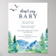This rocky mountain "Don't Say Baby" game sign is the perfect interactive game for an outdoor baby shower. The design features a blue and green painted wilderness landscape with watercolor pine trees, birds and mountains.