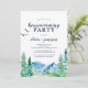 This Rocky Mountain housewarming party invitation is perfect for an outdoor event. The design features a blue and green painted wilderness landscape with watercolor pine trees, birds and mountains.