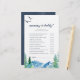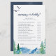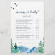 This rocky mountain "mommy or daddy" game is perfect for an outdoor baby shower. The design features a blue and green painted wilderness landscape with watercolor pine trees, birds and mountains. You can personalize the game questions by clicking the "customize" button.