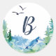 These Rocky Mountain monogram wedding envelope seals are perfect for an outdoor wedding. The design features a blue and green painted wilderness landscape with watercolor pine trees, birds and mountains. Personalize the label with the last initial of the bride and groom.