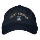 Sunshade featuring Rocky Mountain National Park with tri-colour camping symbol; all professionally embroidered. Looks great on distressed stone-coloured cap, but mix and match and customize. This version is available on three hat styles.
