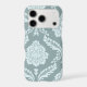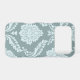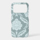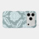 A vintage style decorative damask off-set surface pattern influenced by rococo classical design in duck egg blue color detail on a teal background.