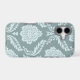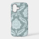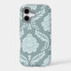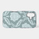 A vintage style decorative damask off-set surface pattern influenced by rococo classical design in duck egg blue color detail on a teal background.