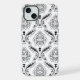 A vintage style decorative damask surface pattern influenced by rococo classical design in black line and leaf fill details on a white background.