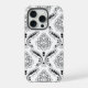 A vintage style decorative damask surface pattern influenced by rococo classical design in black line and leaf fill details on a white background.