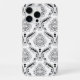 A vintage style decorative damask surface pattern influenced by rococo classical design in black line and leaf fill details on a white background.