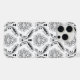 A vintage style decorative damask surface pattern influenced by rococo classical design in black line and leaf fill details on a white background.