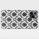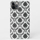 A vintage style decorative damask surface pattern influenced by rococo classical design in black detail on a white background.