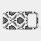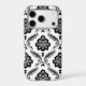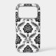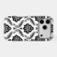 A vintage style decorative damask surface pattern influenced by rococo classical design in black and grey details on a white background.