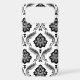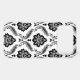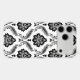 A vintage style decorative damask surface pattern influenced by rococo classical design in black and grey details on a white background.