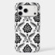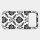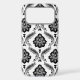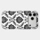 A vintage style decorative damask surface pattern influenced by rococo classical design in black and grey details on a white background.