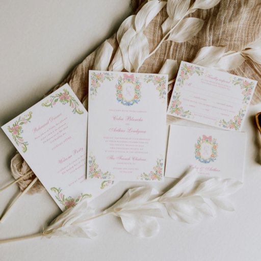 The card adorns a soft pastel, hand-painted floral border design, inspired by the beauty of the Rococo era. The intricate design features a harmonious blend of blue, gold, soft pinks, and greenery.